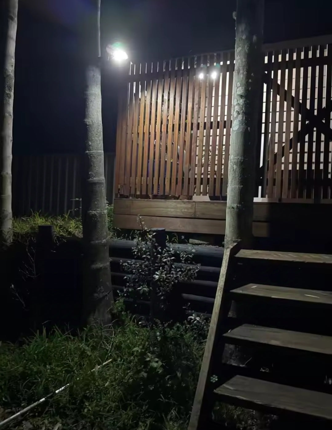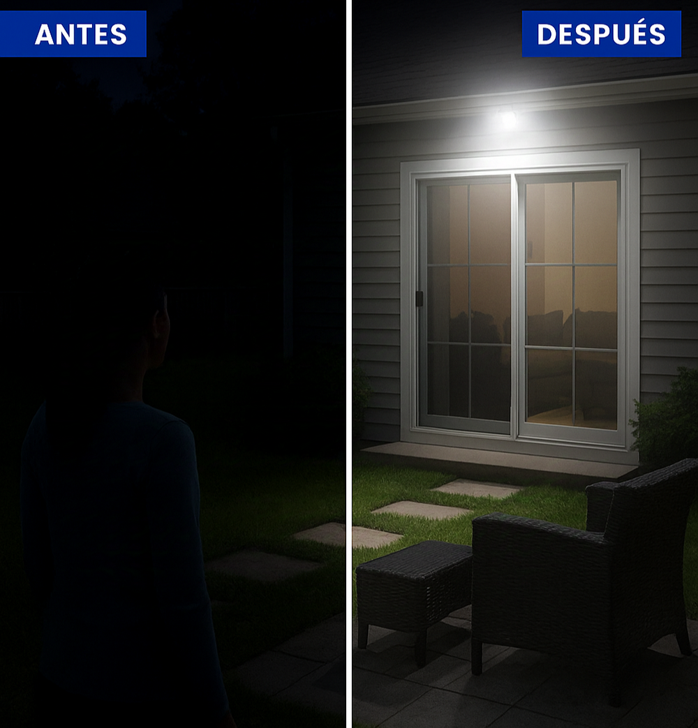 Tiene luz LED blanca de alta potencia, suficiente para iluminar patios, entradas o estacionamientos completos.